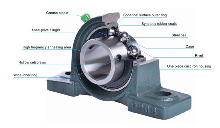 ये इकाइयाँ रेडियल बॉल बेयरिंग, सील और उच्च ग्रेड कच्चा लोहा या दबाए गए स्टील के आवास का एक संयोजन हैं जो विभिन्न आकार में आते हैं। मिलान बियरिंग की बाहरी सतह और आवास की आंतरिक सतह गोलाकार होती है ताकि इकाई स्वयं संरेखित हो।